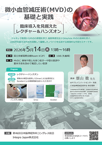 本セミナーでは、微小血管減圧術(MVD)をこれから実施したい、または関心をお持ちの脳神経外科医を対象に、MVDの基本概念から実践的な手技のポイントまでを、レクチャーとハンズオンを組み合わせた形式で学んでいただきます。 前半のレクチャーでは、MVDの適応や手術戦略、重要な解剖学的ランドマーク、合併症回避の考え方などについて、臨床経験に基づき体系的に解説します。 後半のハンズオンでは、実際の手技を想定しながら、アプローチの考え方、操作手順、手技上のコツや注意点について、講師の直接指導のもとで実践的に体験していただきます。 単なる手技の模倣にとどまらず、「なぜその操作が必要なのか」「どこに注意すべきか」といった思考プロセスを重視し、明日からの臨床にすぐ活かせる知識と技術の習得を目指すコースとなっております。 |