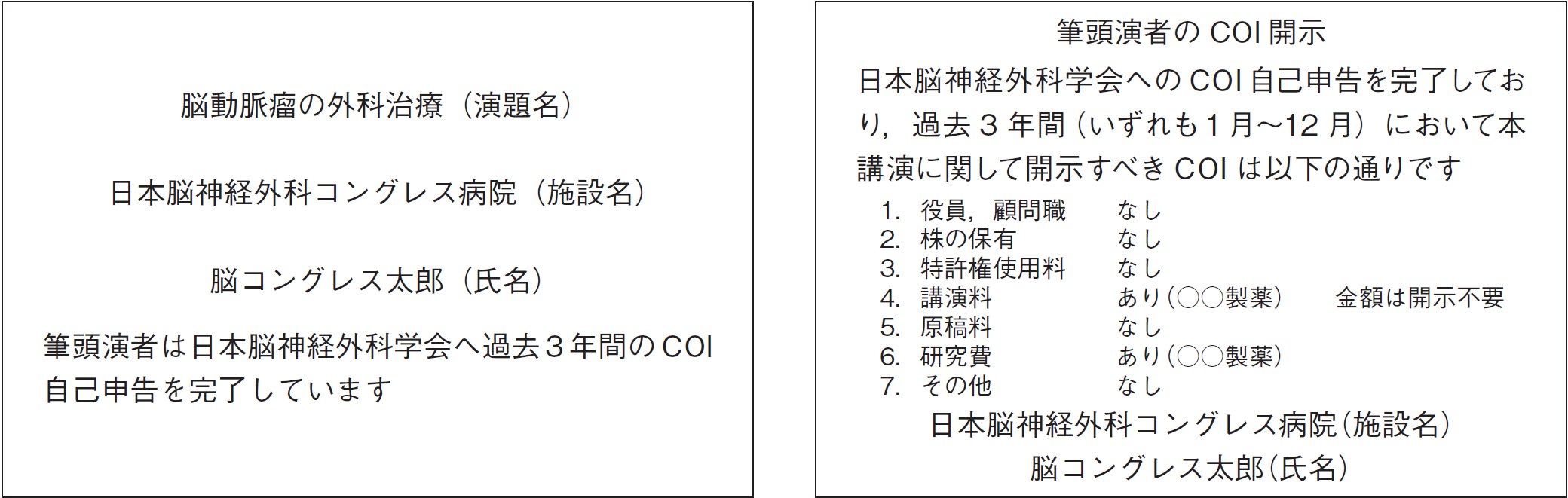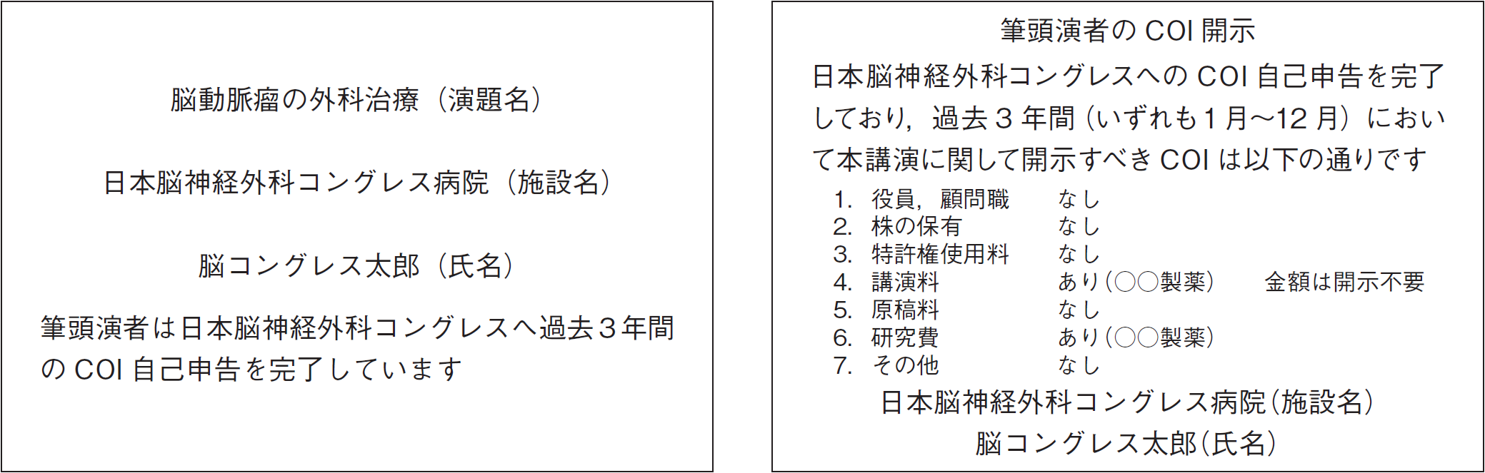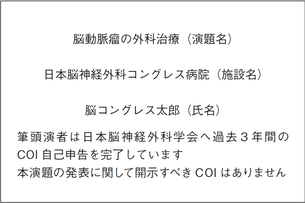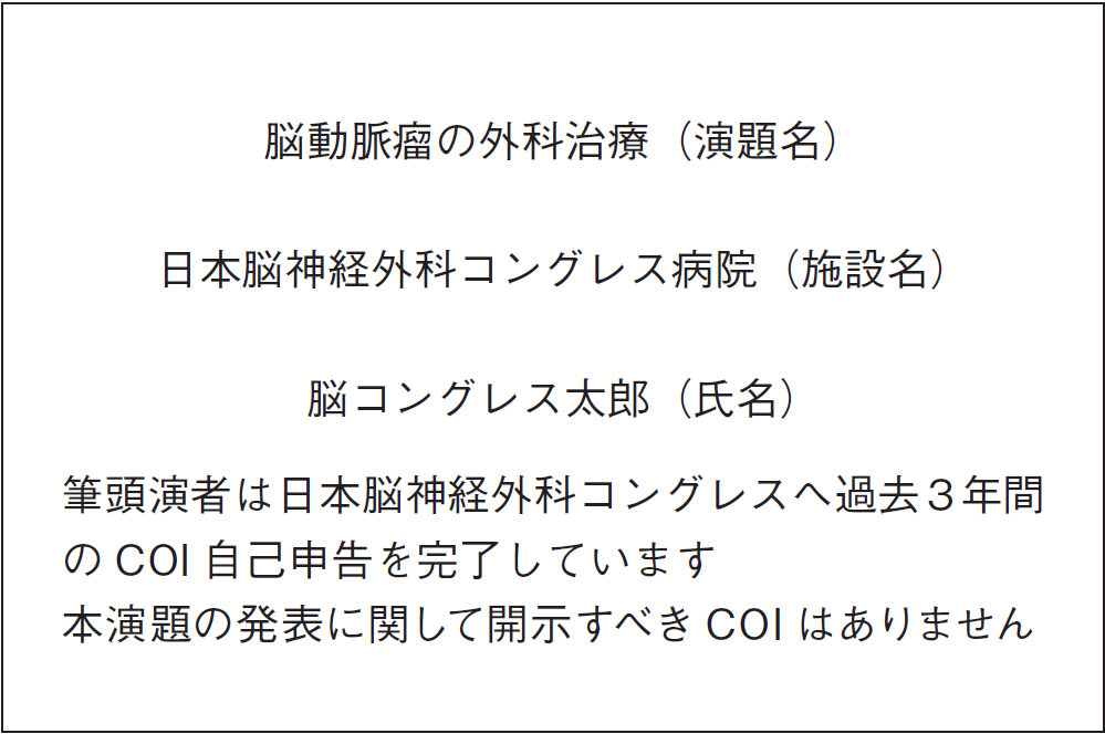 本総会でのすべての発表者には本学会のCOI指針・細則に基づいてCOI申請を行っていただきます。発表スライドの2枚目(タイトルの後)に、利益相反の開示を必ず提示いただきます。